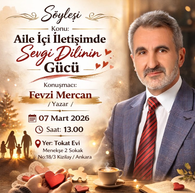 Mercan, bu hafta Ankara’daki Tokatevi’ne konuk oluyor. Yazar Şahin Ali Şen’in koordinatörlüğündeki “Aile İçi İletişimde Sevgi Dilinin Gücü” başlıklı buluşma, Ankara Kızılay’daki Tokat Evi’nde gerçekleştirilecek.