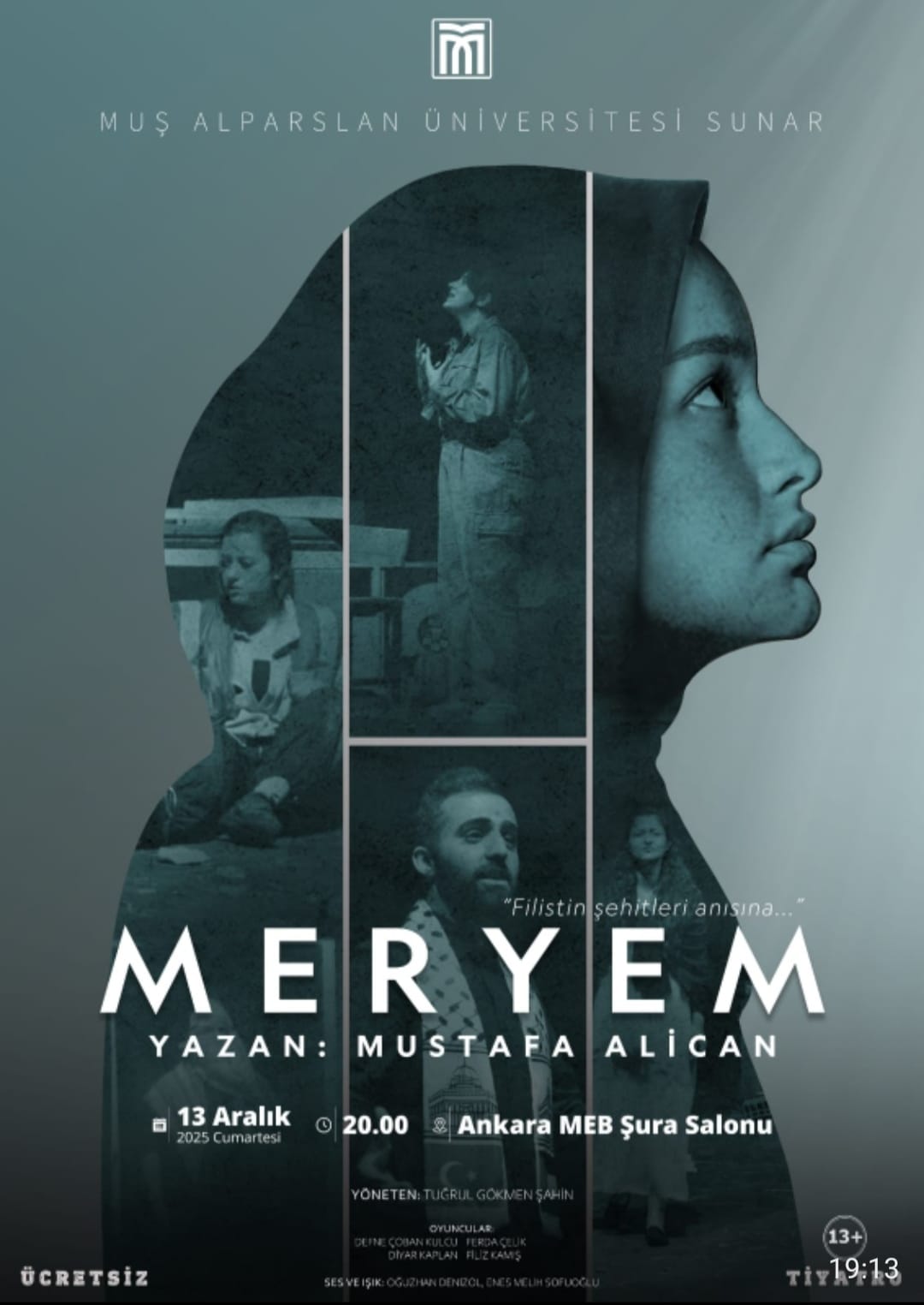 Prof. Dr. Mustafa Alican tarafından kaleme alınan “Meryem”, Gazze’de yaşanan acıları sanatın diliyle aktarmayı amaçlıyor. Oyun, 13 Aralık Cumartesi günü saat 20.00’de Ankara MEB Şura Salonu’nda tiyatroseverlerle buluşacak. Etkinliğin ücretsiz olması ise geniş bir katılım beklentisi oluşturuyor.