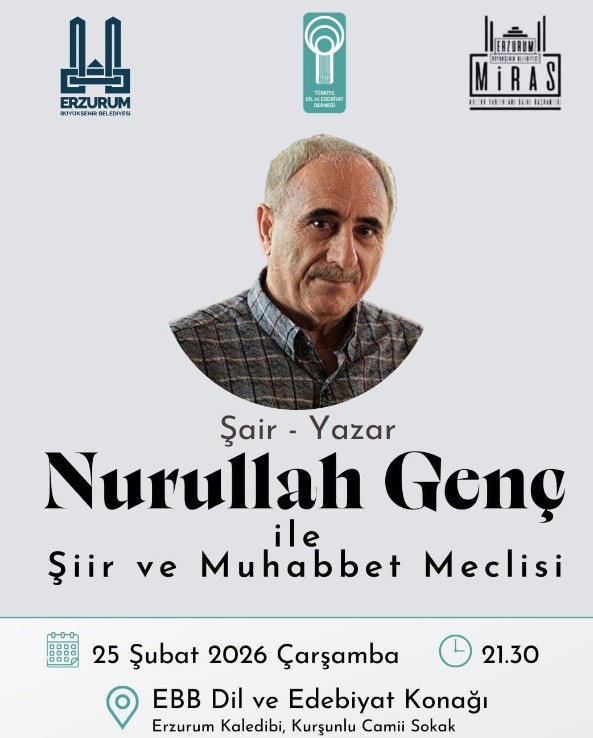 Programın konusu ise “Nurullah Genç ile Şiir ve Muhabbet Meclisi” olarak belirlendi. Erzurum Büyükşehir Belediyesi Dil ve Edebiyat Konağı’nda yapılacak etkinlik, 25 Şubat 2026 Çarşamba günü düzenlenecek. Söyleşinin başlama saati, teravihten sonra saat 21.30’da.
