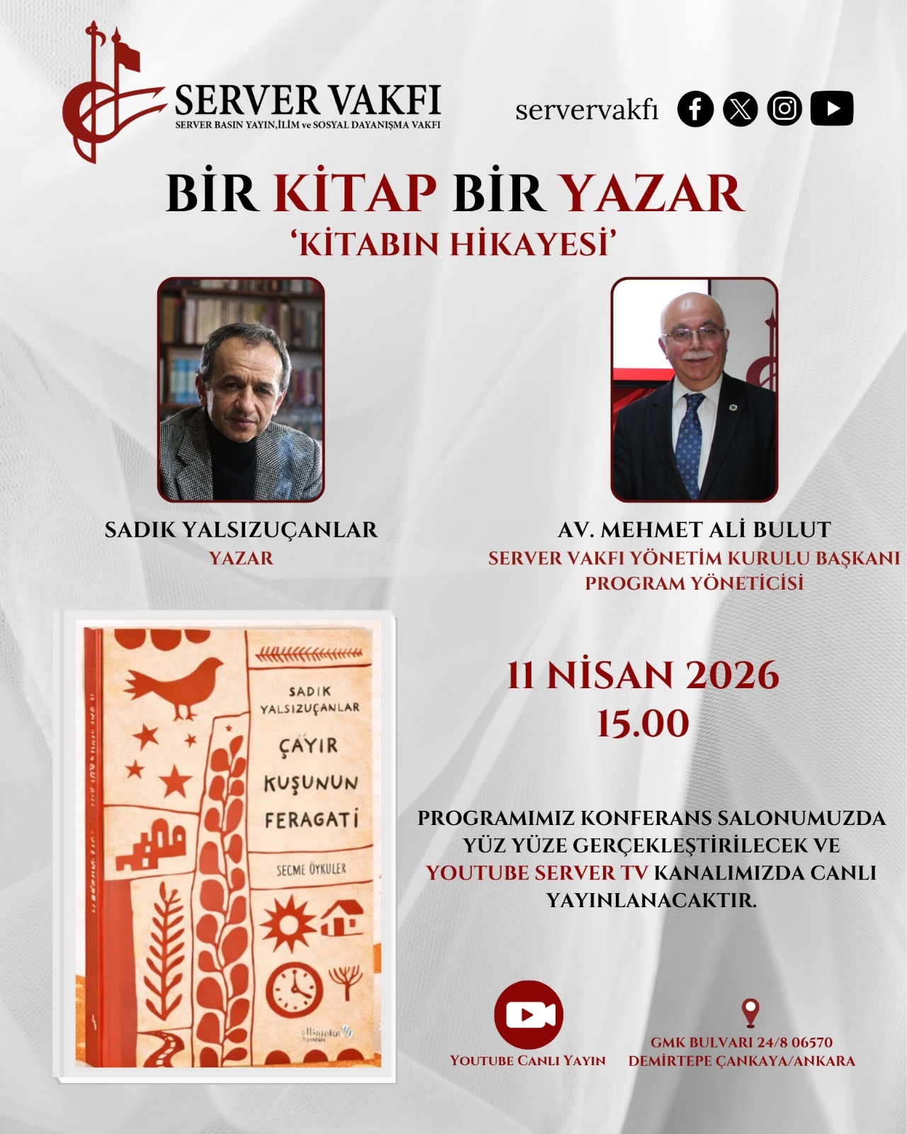 Server Vakfı, kültürel programlarını sürdürüyor. 11 Nisan 2026 Cumartesi günü, edebiyat dünyasının tanınan isimlerinden Yazar Sadık Yalsızuçanlar’ı ağırlayacak.