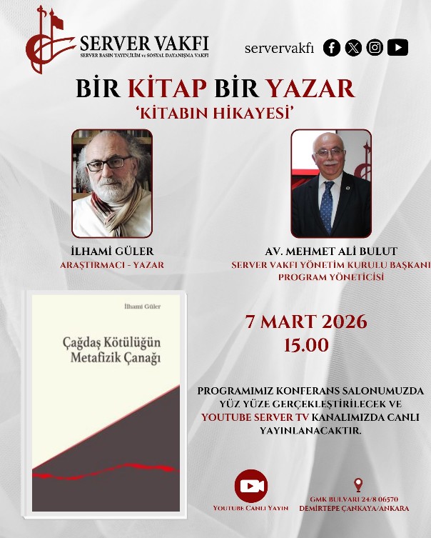 Program kapsamında İlhami Güler’in “Çağdaş Kötülüğün Metafizik Çanağı” adlı çalışması  değerlendirilecek. Etkinlik, Server Vakfı Yönetim Kurulu Başkanı Av. Mehmet Ali Bulut’un yönetiminde gerçekleştirilecek.