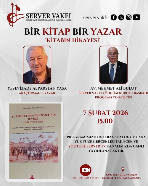 Program kapsamında Yesevîzâde Alparslan Yasa’nın “Filistin Cephesi Hezimetinin İçyüzü (19-20 Eylül 1918” adlı çalışması değerlendirecek. Etkinlik, Server Vakfı Yönetim Kurulu Başkanı Av. Mehmet Ali Bulut’un yönetiminde gerçekleştirilecek.